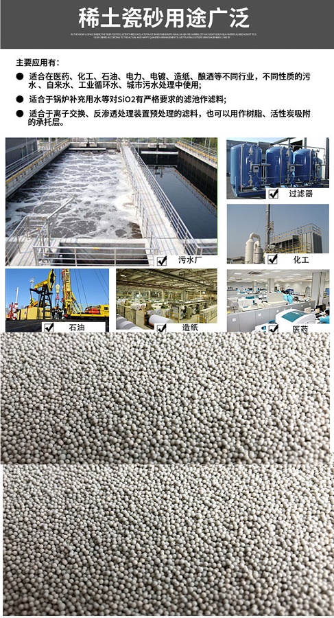 瓷砂濾料是一種球形顆粒,具有很好的穩(wěn)定化學(xué)性能,強(qiáng)度高,耐高溫 耐腐蝕比表面積大,截污吸附性能好,顆粒均勻,比重適中。稀土瓷砂濾料含油增強(qiáng)及耐腐蝕性的稀土,具有瓷砂濾料的性能外,吸附性能增強(qiáng),化學(xué)穩(wěn)定性能好,適合做反滲透過(guò)濾和超濾介質(zhì)。 在單層濾池  雙層濾池 雙層過(guò)濾器,離子交換器等過(guò)濾上班中作過(guò)濾介質(zhì)及墊層,可以處理各種工業(yè)污水 工業(yè)用水 城市污水等。